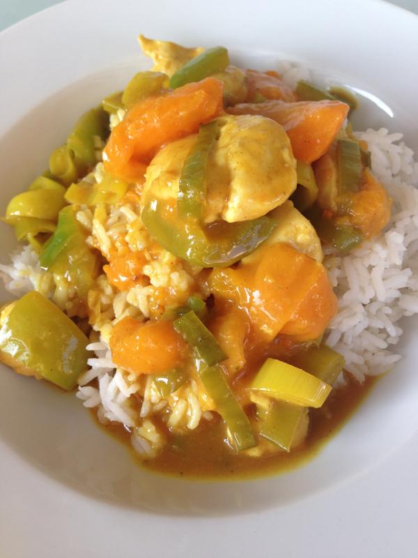 schnelles curry mit hähnchenbruststreifen, lauch, grüner paprika, frischen aprikosen, kokosmilch, mangopüree. dazu basmati. in 20 min wars fertig :D