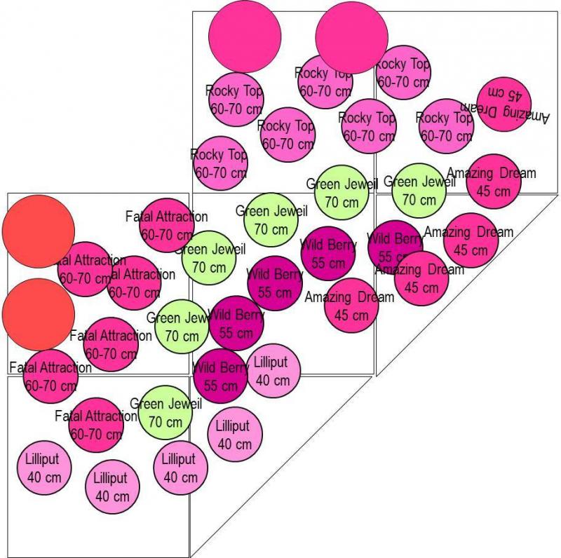 Das Beet ist nicht gleichschenkelig, im rechten Bereich steht auch noch zusätzlich eine Aster und ein paar Schwertlilien, die sind im Plan nicht mehr ersichtlich. Die 4 bunten unbeschrifteten Kreise sind Restbestände an Monarden, die ich dort eingepflanzt habe, um die anfängliche Leere ein wenig zu füllen (die auf dem Übersichts-Bild vielleicht erkennbaren Texasgauras kamen aus dem selben Grund dazu).