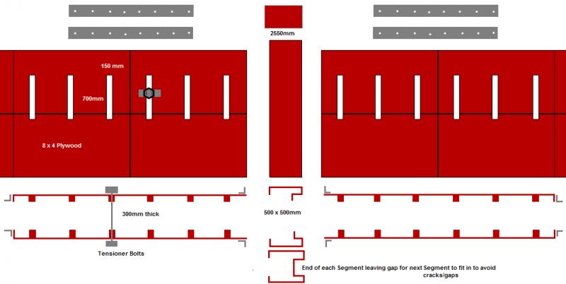 Die Zeichnung vorher ist die Giessform mit Pfosten and den Enden (sieht besser aus wenn man Pfosten dazwischen hat), alles mit Zugstangen durch die Scharten verschraubt damit der Druck die Mauer nicht "aufblaeht".