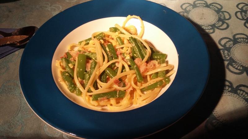 Am Samstag hatten wir Linguine & grüne Gartenbohnen "carabonara".