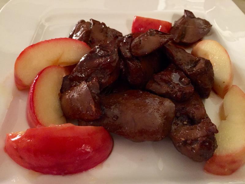 gestern abend gab es gebratene und mit sauerkirsch-apfel-konfitüre und honig glasierte entenleber mit in butter geschwenkten apfelspalten