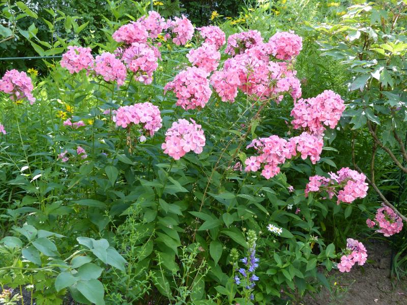 Wie erhofft, sorgt die frühe Phloxblüte für eine schöne Zweitblüte. Pinzierte Stengel von 'Kirmesländler' lassen noch auf sich warten. 'Starfire' hatten die Schnecken geköpft, so dass es statt einer frühen jetzt vier späte "Dolden" gibt.