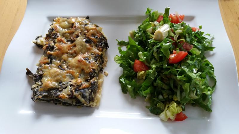 Mangoldlasagne aus den Blättern und Endiviensalat mit Tomaten.