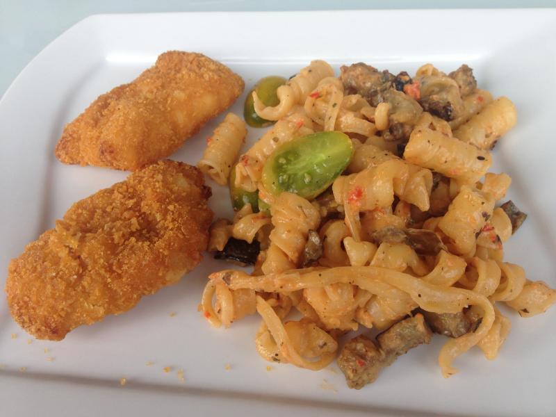 nudeln mit gebratenen gartenauberginen und gartentomaten mit paprikapesto. dazu kleine hähnchenschnitzel