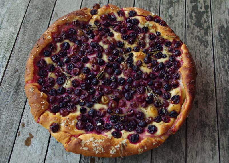 Mmh, feine Sachen gab's wieder bei Euch! Hier gab es gestern Kuchen zum Abendessen - oder vielleicht eher Traubenpizza. ;D Unsere kleinen, runden, blauen Trauben werden reif, die sind genau richtig für Schiacciata all'uva (alle c und a hoffentlich an Bord). Nur leicht süßer Hefeteig mit Olivenöl und Anis, Rosmarin kam auch noch drauf. Dazu ein leichter, angekühlter Rotwein, so war es empfohlen, so war es sehr gut. :) Ich bin ja nicht so bewandert in der Vorratshaltung, wie könnte man denn so was am besten einfrieren?