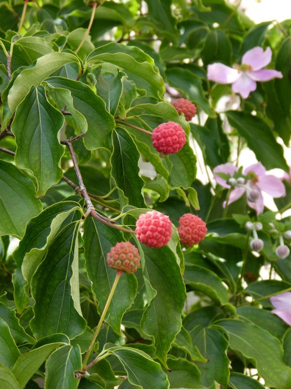 Cornus kousa hatte dieses Jahr einen reichen Fruchtbehang. Die Hitze hat ihn das meiste nun abwerfen lassen.