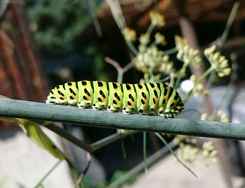 Ich beobachte seit ein paar Tagen eine Schwalbenschwanzraupe im Möhrenbeet.