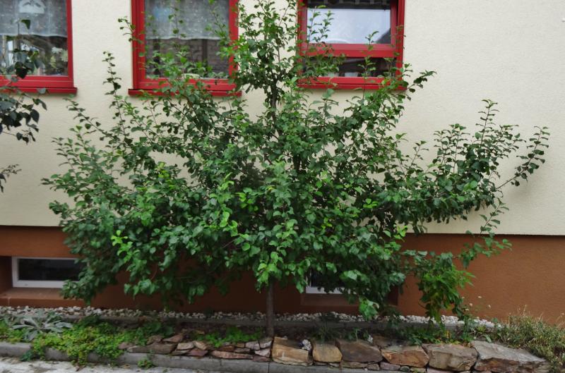 Deswegen ist die Mirabelle auch etwas weit nach oben gezogen. Ich schätze die steht auf Myrobalane, schieben tut sie jedenfalls wie blöd. 4 mal Schere/pinzieren im Jahr ist Pflicht.