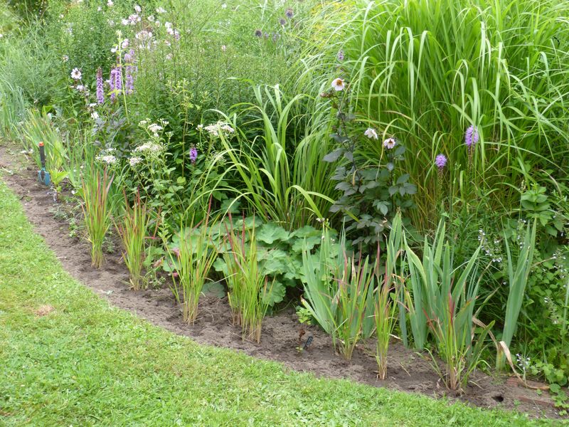 Letztes Wochenende habe ich die Beetkanten ein wenig an die Sichtachse angepasst. Das bisher leicht eingerückte Gräserbeet musste dabei ein ganz klein wenig erweitert werden. Im Topflager hatte ich noch Iris, Nepeta 'Walkers Low', Pennisetum, Chrysanthemum und die im letzten Herbst vermehrten Imperata cylindrica 'Red Baron' (insgesamt neun). Der freie Platz war damit schnell belegt.