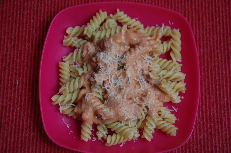 Spirelli mit Soße (pass Tomaten, Frischkäse, Knoblauch, Kräuter der Provence) und Parmesan