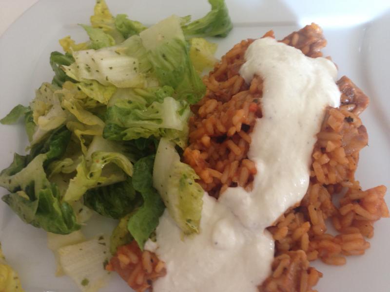 dienstag tomatenreis mit dem restlichen grillfleisch vom vortag drin, knoblauchzitronensauerrahm, salat