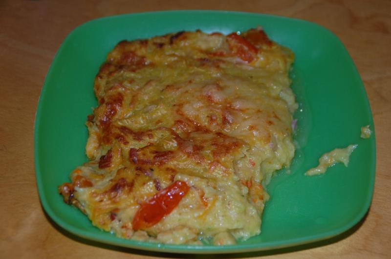 Hier gab es Zucchinipizza (Zucchini, Eier, Tomate, Mehl, Öl, S&P, Zwiebel, Reibekäse, Schinkenwürfel). Leider etwas viel Masse und unter Zeitdruck. Sonst hätte ich vlt sogar dran gedacht, das auf zwei Bleche zu verteilen (und das Bund Schnittlauch reinzuschnippeln, was jetzt immer noch im Kühler liegt ::)...). So war es zwar nicht mehr roh in der Mitte, aber auch nicht ideal durchgebacken :-\. Naja, man lernt ja immer wieder was dazu ::).