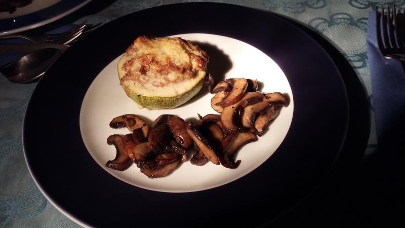 Am Dienstag hatten wir gefüllte Gartenzucchini (hellgrüne Tondi); Füllung: Hack mit Ei, Schmand, gebratenem Zucchinifleisch, S&P und Pecorino. Dazu gab es gebratene Champignons.
