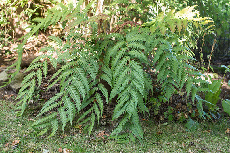 Woodwardia unigemmata steht vorsichtshalber im Topf und wird im Winter geschützt aufgestellt. Er wächst im Topf aus 3 Rhizomen und diese wachsen nach außen, während die alten Austriebsstellen absterben. Die Mitte der Pflanze ist abgestorben, während die Triebe inzwischen den Rand des Topfes erreicht haben. Zur Verjüngung müsste ich die Pflanze in drei Teile teilen und die abgestorbenen Teile entfernen.