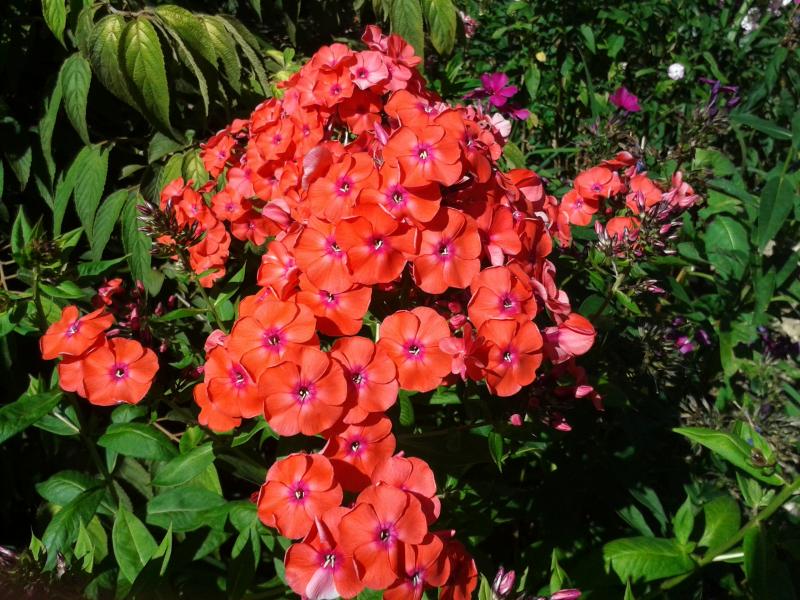 Und diese orangene Blütenwolke im Vordergrund irritiert mich total: Vor vielleicht 40 Jahren hat meine Schwiegermutter aus dem oberhessischen Gärtchen ihrer Mutter einen Ableger einer orange blühenden Pflanze in ihren Garten nach Bonn geholt. Von dort habe ich mir vor ~30Jahren ein Stückchen mit genommen. Immer kümmerte die Pflanze, blühte spät im Sommer mit maximal einer faustgroßen Dolde. Damit sie mir nicht ganz verloren geht, hatte ich sie als einzige Phloxpflanze immer markiert. So bekam sie im neu angelegten Beet einen Platz ganz im Vordergrund. Und nun geschah etwas, was ich nicht verstehe: In einem dunkel violett blühendem Stock erschienen zwei Stiele mit den schmächtigen orangenen Dolden wie ich sie über die Jahre kannte. Und ca.30cm daneben diese unglaublich prächtige und mächtige Pflanze mit nahezu gleichen Blüten. Sie blühen nun ca. seid zwei Wochen :D