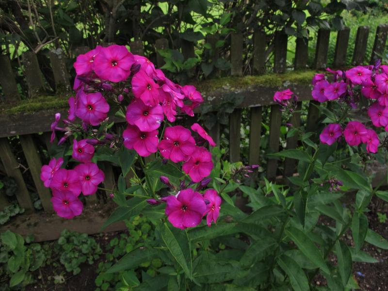 Von dem violetten Phlox vor 'Uspech' hatte ich vor gut 10 Jahren ein paar Pflanzen gekauft, inzwischen sind die Horste beachtlich. Vorigen Sommer schon hatte ich den Eindruck, daß die Blütenrispen früher größer waren und hab ein paar geteilt, mal sehen. Er hat elegante dunkle Stiele und vollkommen gesundes frischgrünes Laub. Leider verblaßt die Farbe auf seinem Sonnenplatz rasch, am schönsten ist er in der Vase. Dieser und der alte Rosa-Weiße haben den stärksten Duft.