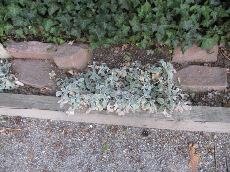 Inzwischen bin ich nicht mehr so überzeugt, von meiner Idee. Hier die Stachys im Vergleich zum banalen Efeu. Beide nicht gewässert.