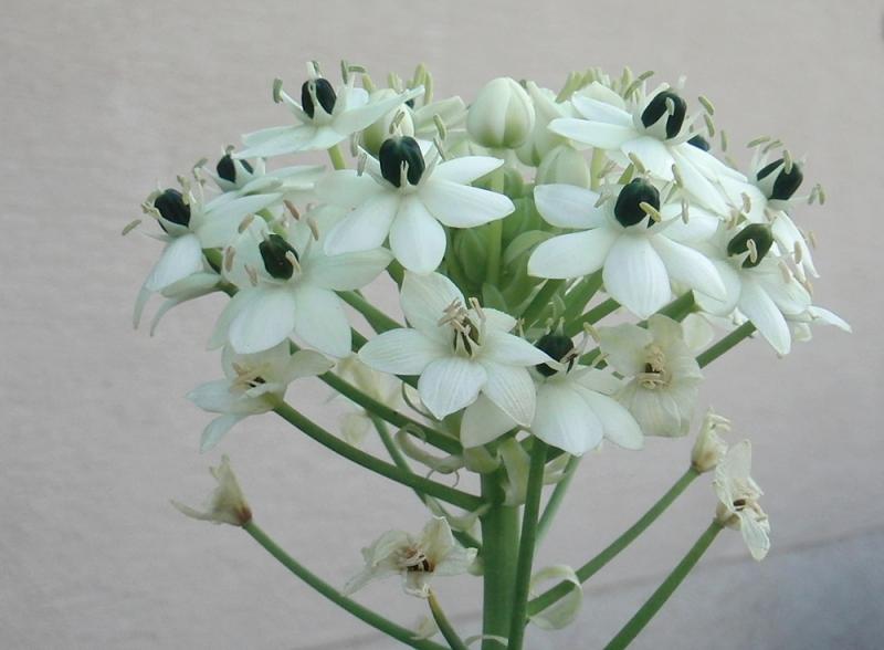 Ich habe immer wieder Probleme, Ornithogalum arabicum und Ornithogalum saundersiae zu unterscheiden. Nach manchen Quellen scheint mir O. arabicum kugelförmige, O. saundersiae eher eiförmige Fruchtknoten zu haben. Danach wäre das O. saundersiae. Nach der European Garden Flora sollen sich beide Arten in der Länge der weißen Blütenblätter unterscheiden, bis 1,5 cm lang bei O. saundersiae, 15 bis 3 cm lang bei O. arabicum. Ob das bei kultivierten Pflanzen auch immer so sein muss, weiß ich nicht.