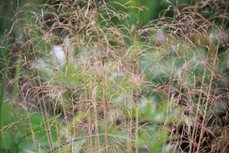 Deschampsia cespitosa 'Goldtau' ist neu hier eingezogen und passt farblich perfekt zum frühen herbstlichen Eindruck im Garten. Die Tropfen stammen aus der Gießkanne, da Regen hier langsam zum Fremdwort wird.