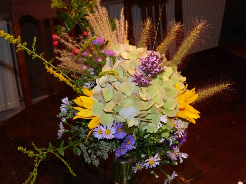 Habe heute am lauen Abend meine Herstdeko gebunden ! Habe dafür fette Henne , Hortensien und Heide verwendet.