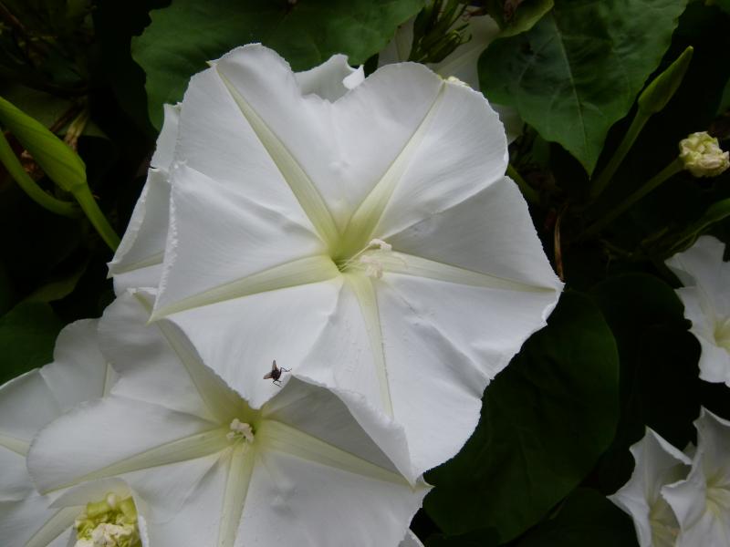 ja, das ist eine andere Art, Calonyction album, mehrjährig (überwintern als Steckling), Blüten viel größer als I. purpurea und mit einer ganz langen Kronröhre (durch Schwärmer bestäubt). Die Büten öffnen sich abends (man kann zusehen, die öffenen sich bei Wärme ganz fix) und verblühen am Morgen. Und sie duftet sehr stark.