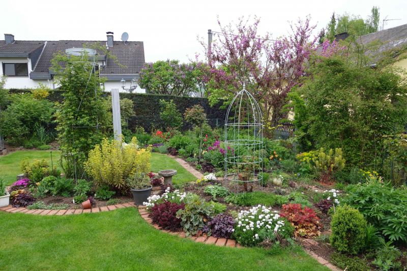 Ich bin nicht sicher, ob die Proportionen zur Rasenfläche und zum Gesamtgraten passen. Eine größere Fläche verleiht dem Beet und der Bepflanzung mehr Bedeutung, es erweitert die Möglichkeiten und bietet eigentlich erst dann den Raum und die Fläche für eine Randbepflanzung. Die Rosen stehen gerade etwas "nackt" da. Die Gesellschaft von (mehr) Stauden und auch Gräser könnten ihnen gut tun.