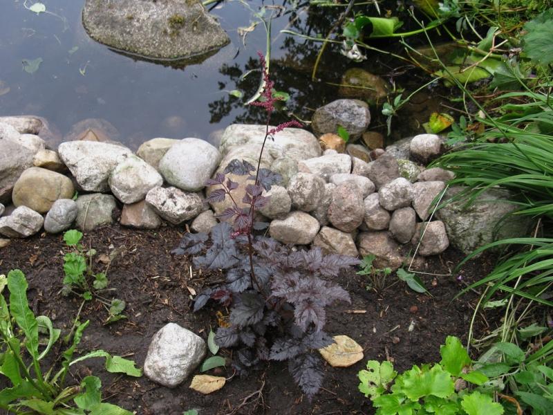 Die Sorte 'Chocolate Shogun' hat hier auch im zweiten Standjahr überzeugt. Obwoh sie der angeblich so feuchtigkeitsbedürftigen Astilbe thunbergii zugeordnet wird, hat sie die Nagelprobe eines extrem heißen und trockenen Spätsommers hier nicht nur am relativ dauerfeuchten Teichrand sondern auch an einer anderen Stelle im Garten unbeschadet überstanden, an dem beispielsweise Polygonum amplexicaule jetzt deutliche Hitze- und Trockenheitsschäden zeigt. Mehr kann man eigentlich nicht erwarten.
