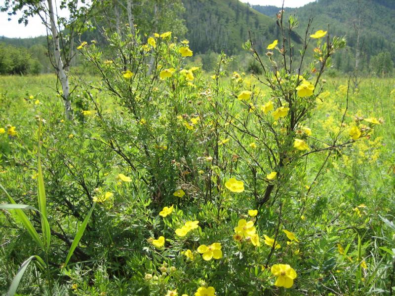 Es ist eigenartig, wenn man wild dem Strauchigen Fingerkraut (Potentilla = Dasiphora fruticosa) begegnet. Man kennt es ja sonst aus unvorteilhaften Ecken des öffentlichen Grüns. Wild in der Flusstalwiese dann doch wieder ganz hübsch!