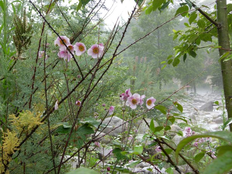gleiche Reise, Herbstanemonen zwischen Tamarisken im Flussbett:
