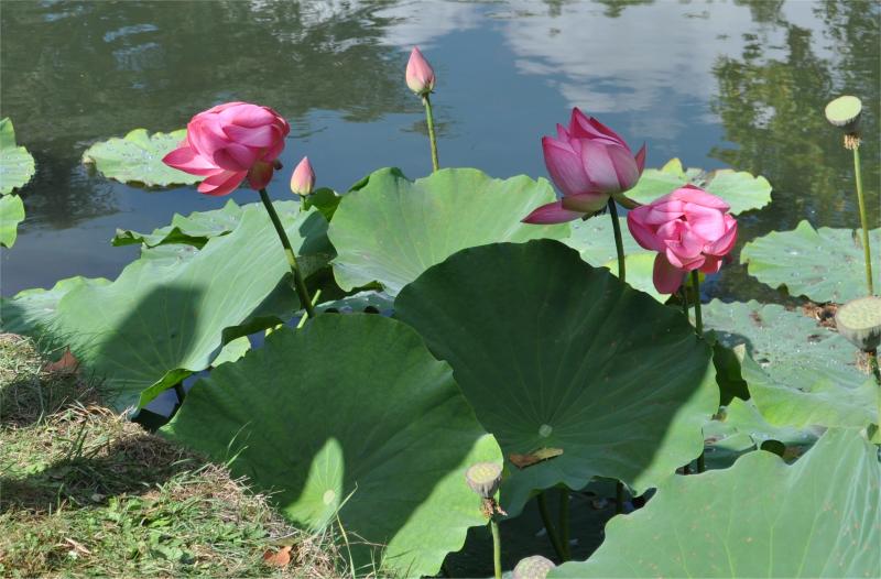Hast du die Lotosblumen im Teich gesehen? Viele Blüten noch, die Farbe ist fast psychedelisch: rosarot mit gelb bis neongrün.