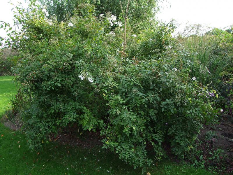 Es wuchert und blüht eine große,einfachblühende Rose,die jetzt viele kleine Hagebutten angesetzt hat.Ich dachte die ganze Zeit,dass sich eine Unterlage befreit hatte und fand nun nach Namensgoogelei heraus,dass sie so sein soll wie sie ist.