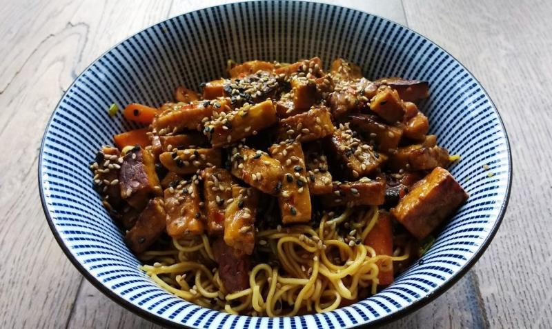 Hier gab es gerade Panasiatisches - indonesisch marinierter Tempeh mit Wokgemüse, Mienudeln und drüber Gomasio (noch vom Onigiri machen übrig).