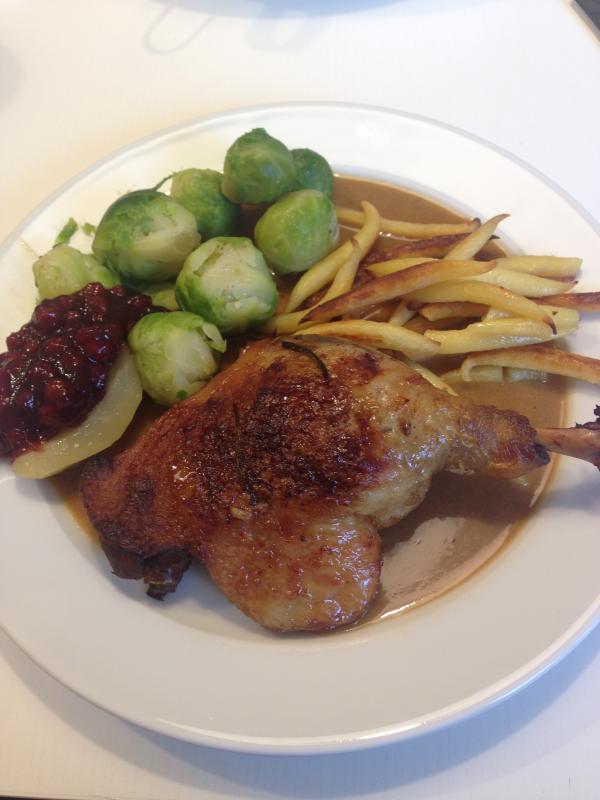 heute das erste richtige herbstessen. entenkeulen mit schupfnudeln, rosmarin-rotweinsoße, rosenkohl und preiselbeeren. :P