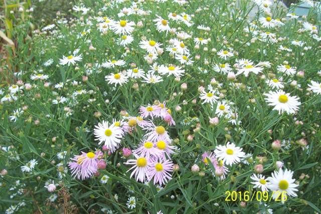 Letztes Jahr hatte ich auf dem Gartenmarkt in Staßburg eine rose Boltonia gekauft und neben meine weiße gesetzt. Hier sieht man deutlich den Unterschied. Im Vordergrund die rosafarbene.