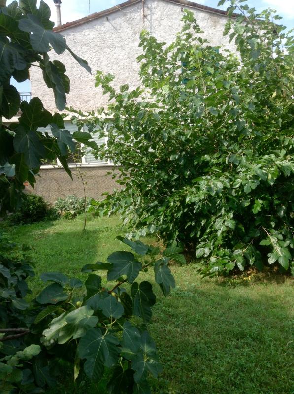 Hier ein Foto des künftigen Kompostplatzes, er soll etwa dort entstehen, wo der waagrechte Ast des Feigenbaums ins Bild ragt bis zum ersten sonnigen Eck