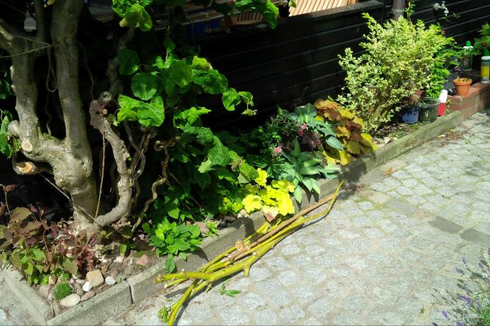 Die Kirengeshoma habe ich dieses Frühjahr gepflanzt. Bis jetzt ist sie nicht über 30 cm Höhe hinausgekommen und die Blüten liegen, wenn man sie nicht stützt, auf dem Boden. :P Hoffe nächstes Jahr geht da etwas mehr.