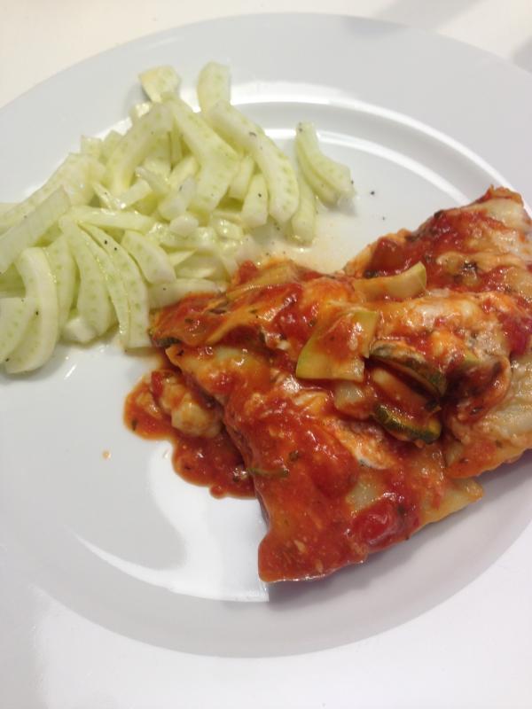Hier gabs schnelle maultaschen mit Tomatensoße und Käse überbacken. Ein paar zucchinischeiben waren auch mit drin