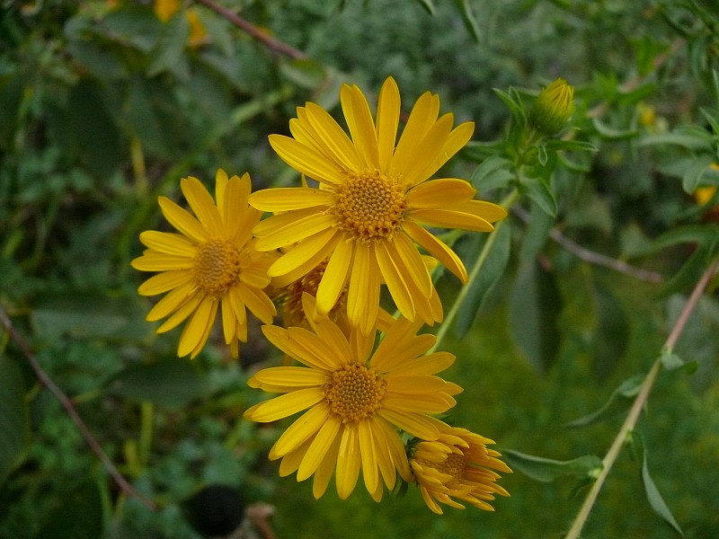 Die Chrysopsis/Heterotheca camporum var. glandulissimum, die ich voriges Jahr von lerchenzorn bekommen habe, macht sich ausgesprochen gut, obwohl sie immer noch im Topf steht. Sie hat's bis auf 160 cm Höhe geschafft, nur der Regen hat sie jetzt ein wenig gebeugt. Die Blüten leuchten herrlich und holen mir bei dem Wetter die Sonne in den Garten :D.