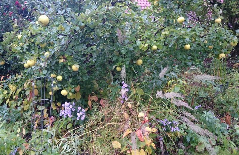 Auch der Quittenbaum fügt sich malerisch in die Herbstlotterei ein.