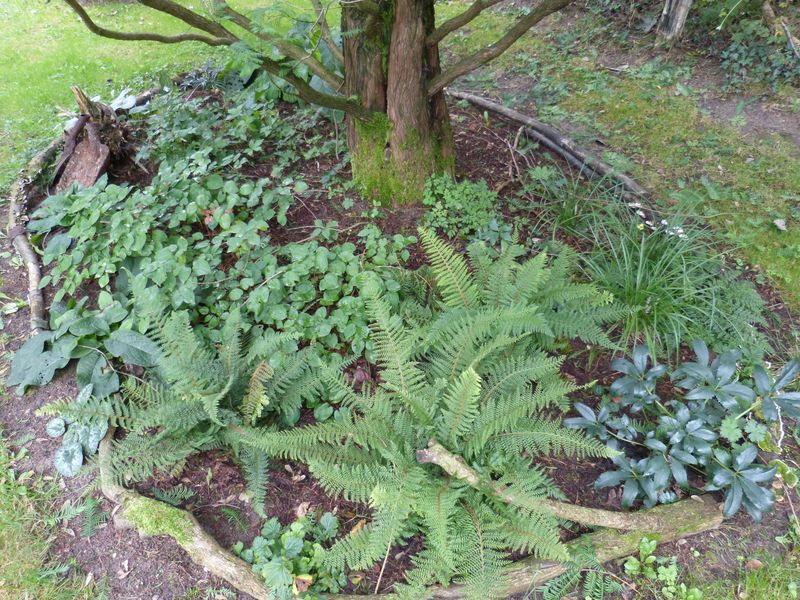 Ich bin schon davon ausgegangen, dass die Situation bei dir weitläufiger ist. Es sollte auch nur verdeutlichen, welche Stauden dort gut aushalten. Das Empimedium ist sehr wüchsig und macht schnell "Fläche" (die Sorte gleicht einer eierlegenden Wollmilchsau, macht von trockenem Schatten bis zu trockener Vollsonne nahezu alles mit und wächst trotzdem). Darin einige größer werdende Polystichum eingestreut, drumherum ein paar Flächen mit Cyclamen, und einige Gräser dazwischen... Polypodium vulgare macht auch viel mit und ist recht wüchsig (hier zumindest).