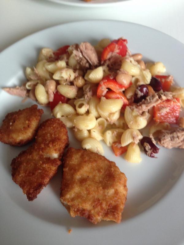 Kleine Schnitzelchen mit Salat aus Paprika, Thunfisch, Kichererbsen, Bohnen, Nudeln.