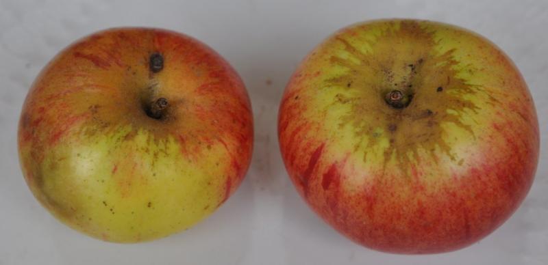 - Schale ziemlich fettig, glatt, Grundfarbe sattes, etwas grünliches Gelb, auf der Sonnenseite deutlich flächig gerötet, je nachdem wo die Sonne hinkommt, ohne die Grundfarbe völlig zu überdecken, diese matte Rötung ist auf der Fruchtoberseite nochmals mit dunkelroten Streifen überdeckt; wenige kleine hellbraune Lentizellen (auf der Grundfarbe erkennbar, aber von der Deckfarbe mit gerötet und kaum sichtbar); schwacher Geruch