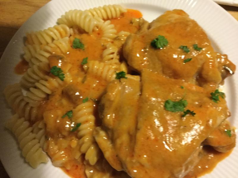 Hier gibt's Paprikahendl mit Spiralnudeln :)