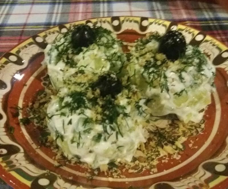 Es gab eine Art Tzatziki mit viel Dill und gehackten Walnüssen. Sehr zu empfehlen.