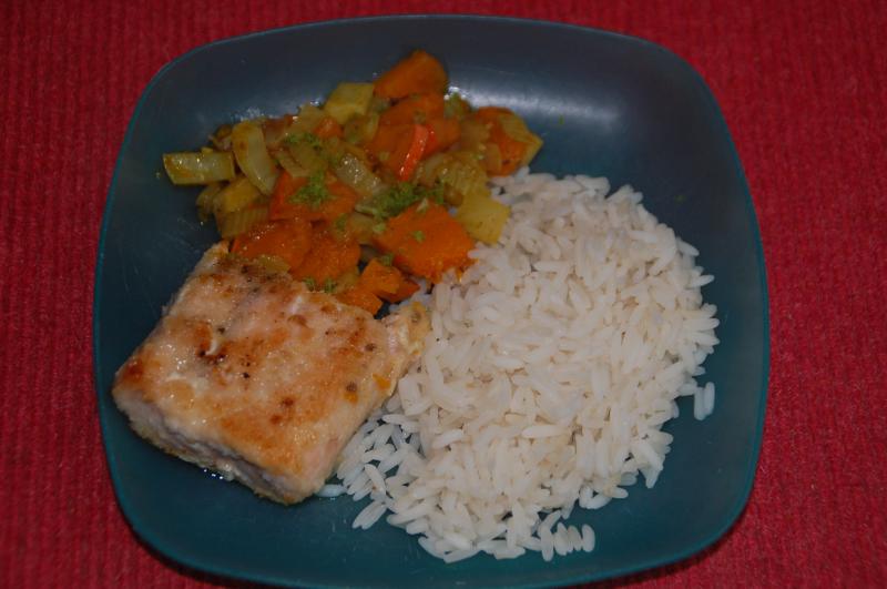 Hier gab es Wildlachs mit Reis und Fenchel-Kürbis-Curry.