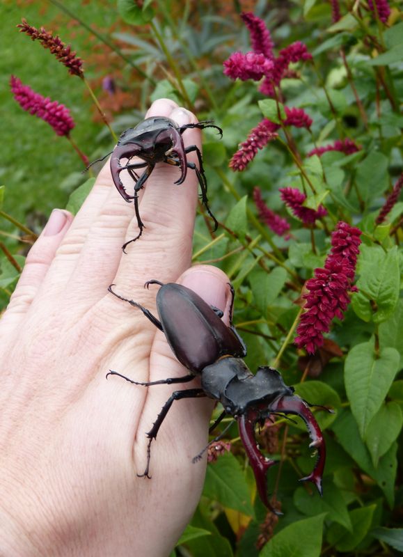 Die nächste Generation Hirschkäfer ist schon fertig und wartet auf den Frühling. Gestern förderten wir unfreiwillig drei Exemplare ans Tageslicht, denen offenbar ein (Eichen-)Zaunpfahl als Kinderstube gefallen hat. Nach dem Knipsen haben wir sie ins andere Hirschkäferquartier im Garten gebracht, wo sie hoffentlich weiter überwintern.