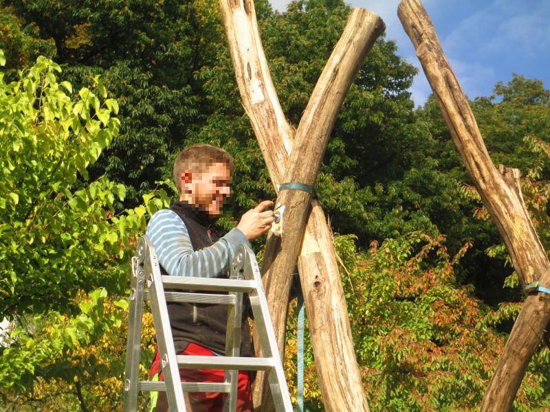 Nun werden die Berührungsstellen abgeflacht, dazu muss man die Spanngurt-Verbindung wieder lösen. Die Pfosten werden durch Manpower in Position gehalten.