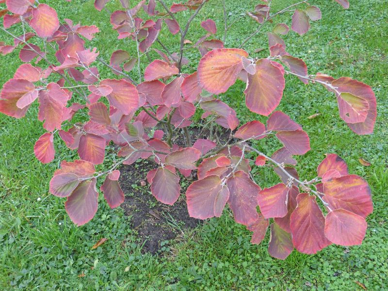 Hamamelis vernalis Amethyst verzaubert schon mal durch Herbstlaub.