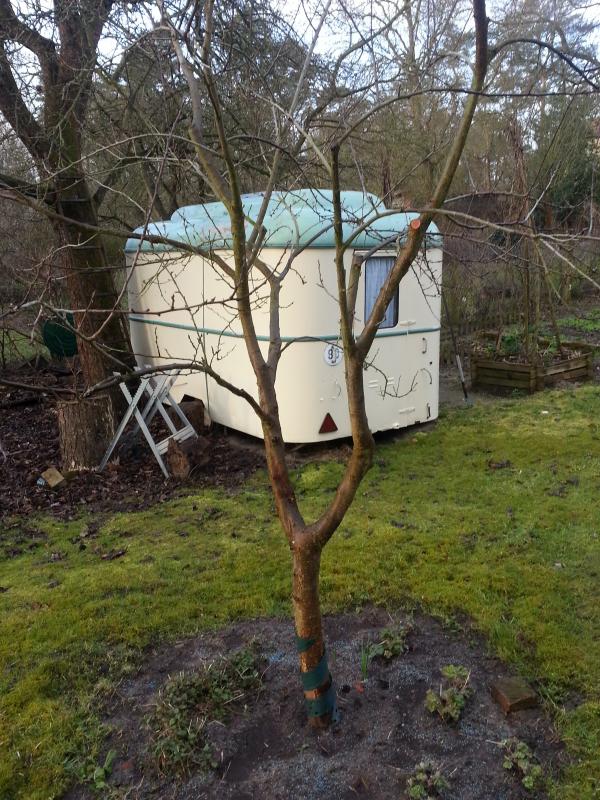 So fast die Rückseite (hinten der große Boskoop) der gibt einen Ganzteil Schatten im Tagesverlauf - aber auch Schutz vor einfallenden Frösten, die gern aus dieser Richtung (südost) kommen.