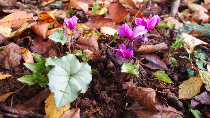 Zu Hause im Garten blühen jetzt noch ein paar Cyclamen hederifolium. Das besonders kräftig pinkfarbene habe ich mal fotografiert.